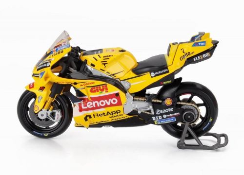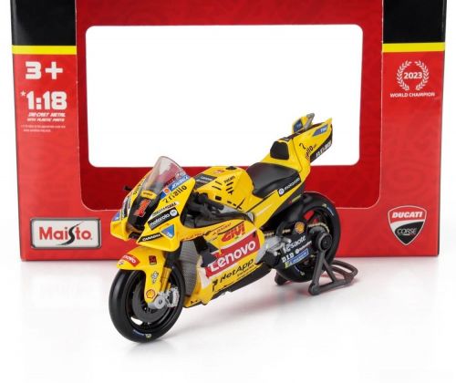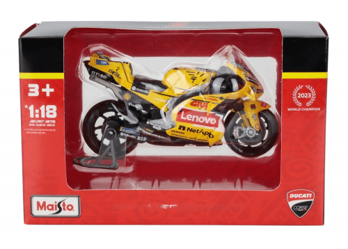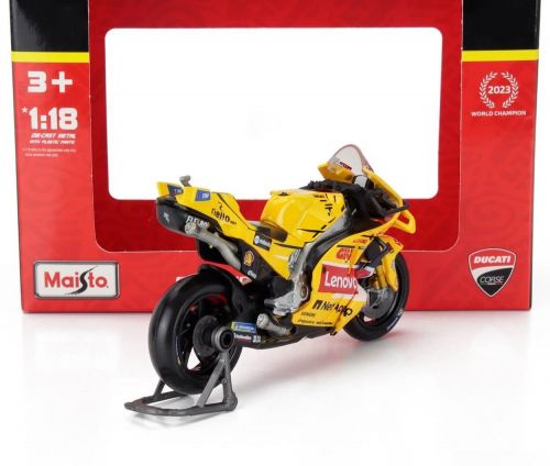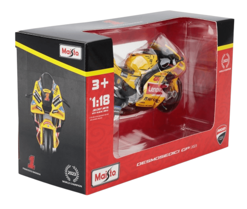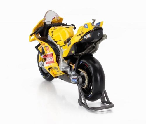 A exclusiva Ducati Desmosedici GP23, pilotada por Francesco Bagnaia na temporada 2023 da MotoGP, ganha destaque nesta versão amarela especial, extremamente diferenciada e desejada por colecionadores.