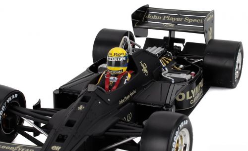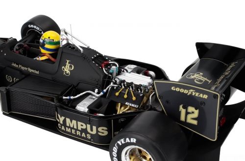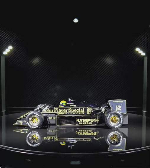 A icônica Lotus Renault 97T, pilotada por Ayrton Senna no histórico GP de Mônaco de 1985, agora eternizada em uma miniatura premium de altíssimo nível.